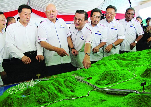 Malaysia’s Prime Minister Najib Razak and Transport Minister Liow Tiong Lai look at a model of the East Coast Rail Line at Kuantan Bahang, Malaysia August 9, 2017. REUTERS/Liz Lee