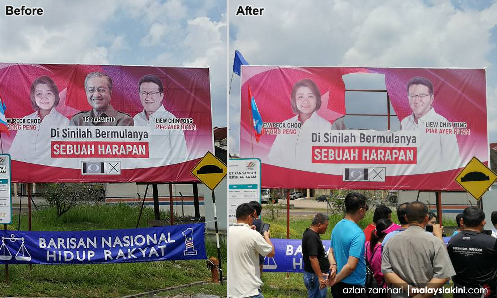 Videos of enforcement officers going around cutting out photos of Dr Mahathir from campaign billboards leaving a gaping hole in its place have gone viral.