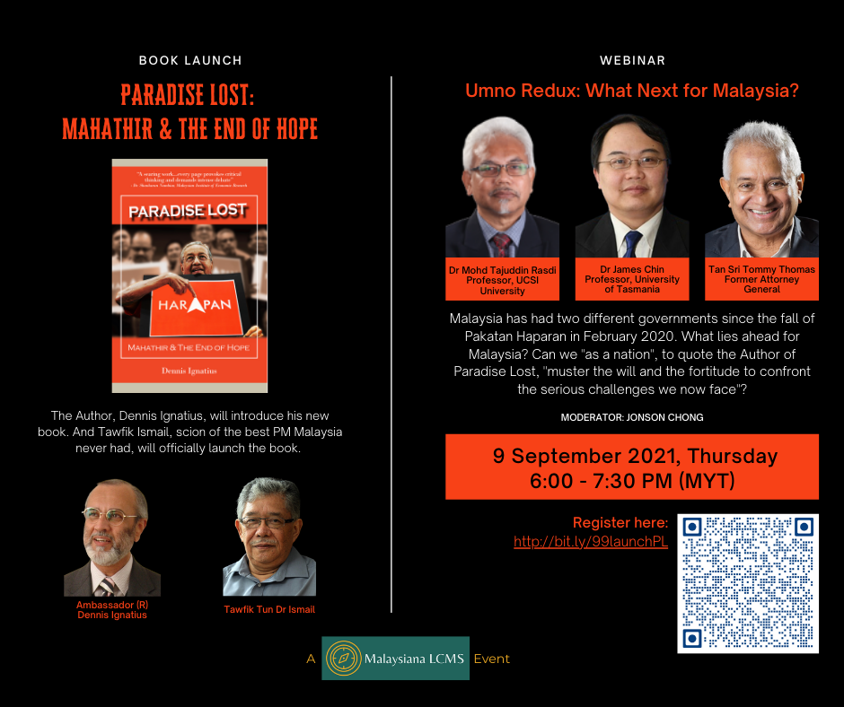 UMNO Redux: What Next for Malaysia 02 Thursday Sep 2021 Posted by Dennis Ignatius in Uncategorized ≈ Comments Off on UMNO Redux: What Next for Malaysia BOOK LAUNCH & SEMINAR 9th September 2021 | 6-7:30 pm Register here Click to share on X (Opens in new window) X Click to share on Facebook (Opens in new window) Facebook Click to email a link to a friend (Opens in new window) Email Click to print (Opens in new window) Print Like Loading... Related